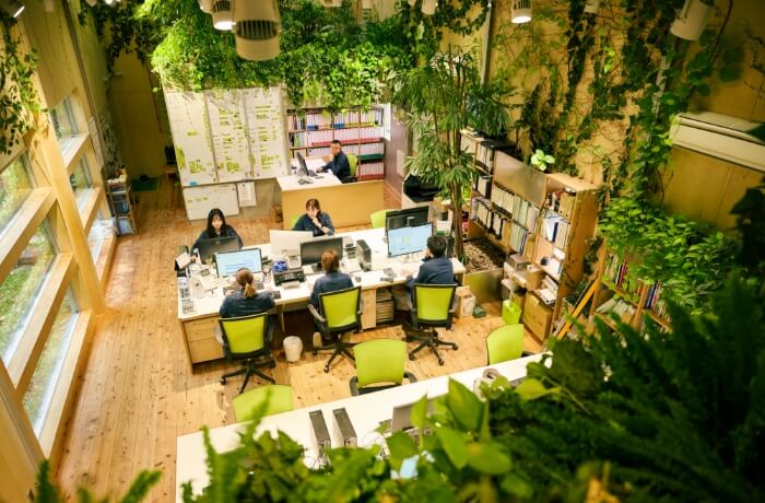 光が差し込み、木のぬくもりが感じられる事務所内は青々としたツタや観葉植物がぐるりと囲い、緑の中で働く心地よさを生み出しています。